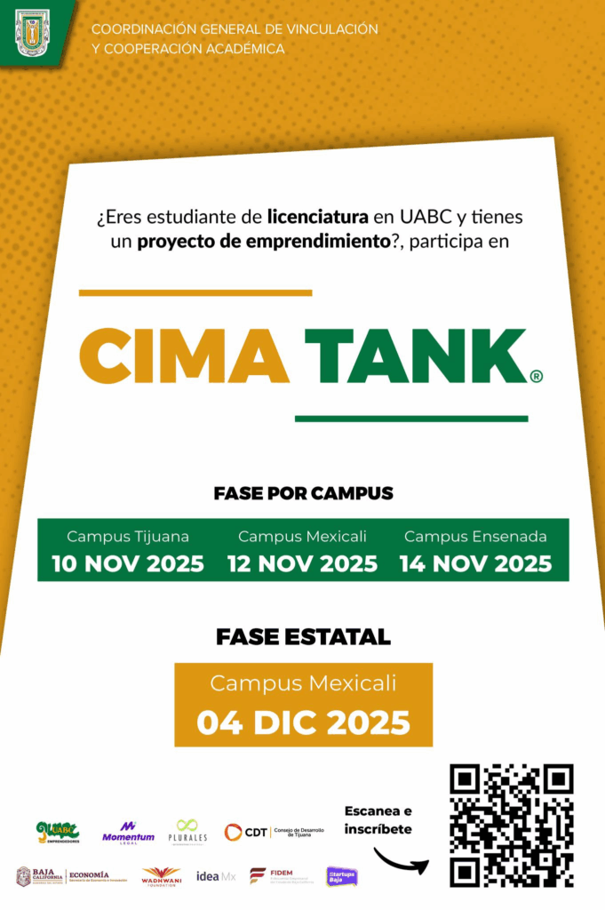 La Universidad Autónoma de Baja California (UABC), a través de la Coordinación General de Vinculación y Cooperación Académica, lanza la edición 2025 de CIMA TANK®, una plataforma que busca identificar, fortalecer y proyectar los emprendimientos estudiantiles más prometedores de la región.