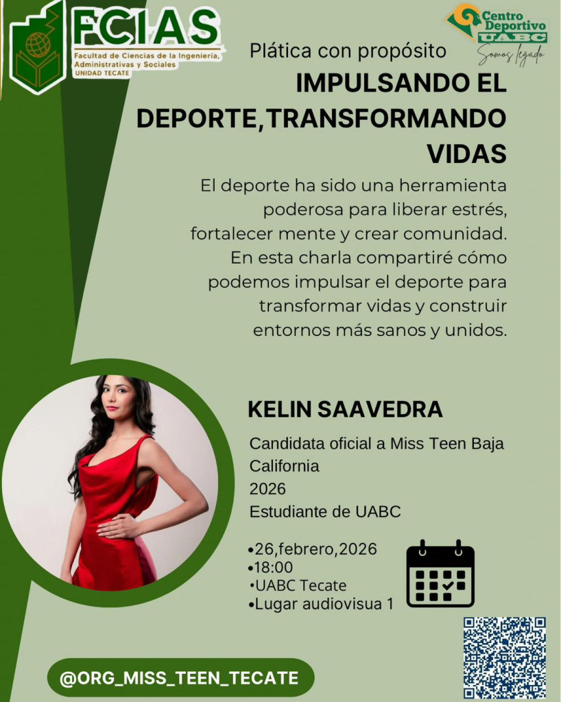 La charla será impartida por Kelin Saavedra, candidata oficial a Miss Teen Baja California 2026 y estudiante de la UABC, quien compartirá su experiencia y visión acerca de cómo el deporte contribuye a liberar el estrés, fortalecer la mente y fomentar entornos más sanos y unidos.