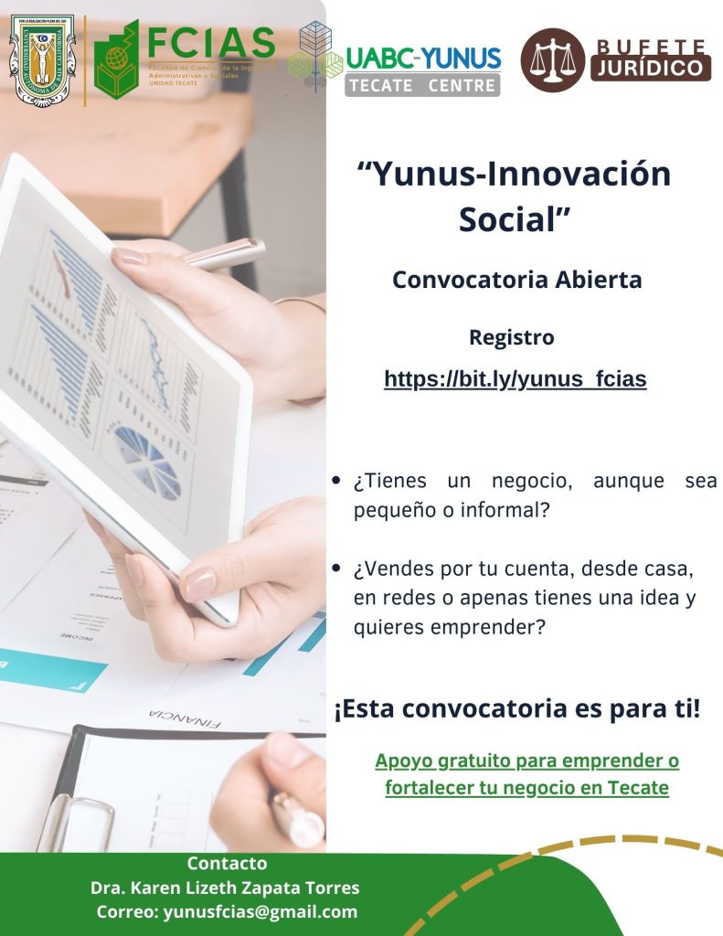 La Facultad de Ciencias de la Ingeniería, Administrativas y Sociales (FCIAS) de la UABC, en conjunto con UABC-Yunus Tecate Centre y el Bufete Jurídico, lanzó la convocatoria abierta “Yunus–Innovación Social”, dirigida a personas que ya cuentan con un negocio —aunque sea pequeño o informal— o que desean emprender a partir de una idea.