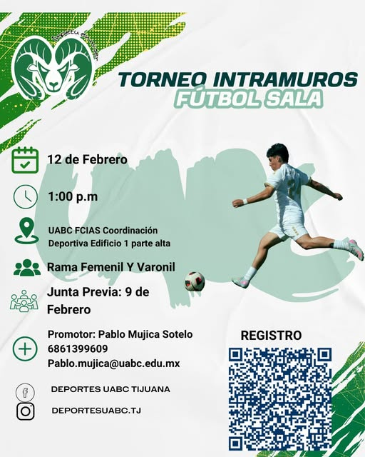 La Coordinación Deportiva de la Facultad de Ciencias de la Ingeniería, Administrativas y Sociales (FCIAS) de la UABC anunció la realización del Torneo Intramuros de Fútbol Sala, dirigido a estudiantes interesados en participar en actividades deportivas universitarias en las ramas femenil y varonil.