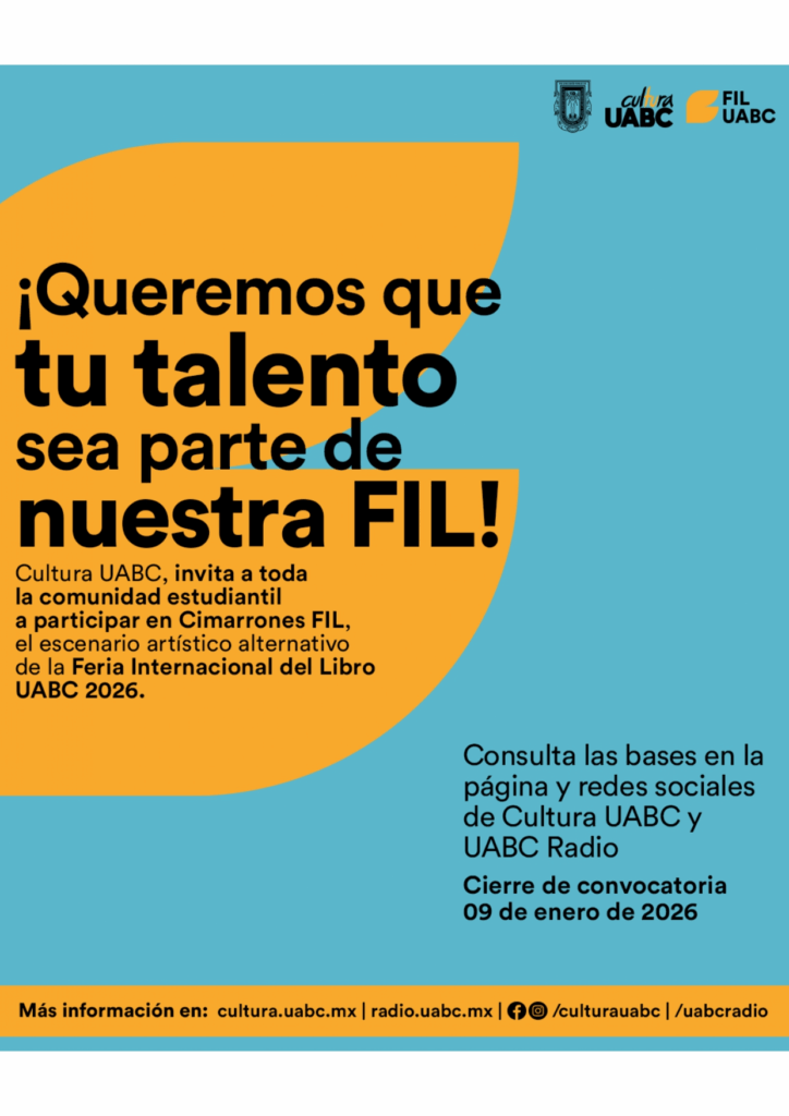 La Universidad Autónoma de Baja California invita a la comunidad a formar parte de la Feria Internacional del Libro UABC 2026. Si tienes talento en la escritura, ilustración, investigación, divulgación o cualquier expresión relacionada con el mundo del libro y la lectura, esta es tu oportunidad para compartirlo y ser parte de uno de los eventos culturales más importantes de la región.